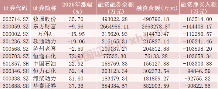 2025年融资客对288只股票减仓金额超1亿元,减仓金额居前的10只股票分别为牧原股份、东方财富、万科A、软通动力、泸州老窖、恒逸石化、中国石油、恒力石化、潍柴动力、华泰证券,分别净卖出16.35亿元、14.44亿元、11.23亿元、10.52亿元、10.39亿元、10.37亿元、10.33亿元、9.48亿元、9.28亿元、9.08亿元。从市场表现看,这10只股票2025年涨多跌少,涨幅最大的恒逸石化涨逾70%。